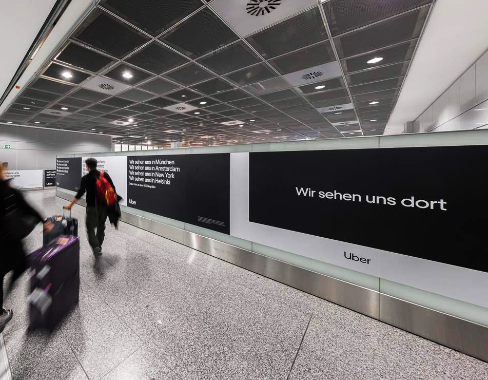 Uber launched an ad campaign to show its commitment to Germany. Active in six cities, the mobility platform highlights its presence with the message “Wir sind hier” (“We are here”) visible across the country through OOH and waytising placements in airports.